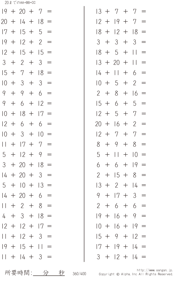 上記のボタンから「20までのAA+BB+CC」の算数数学ドリル・計算ドリル(PDFプリント)がダウンロードできます。個人利用は無料です(家庭以外での配布は有料です)。