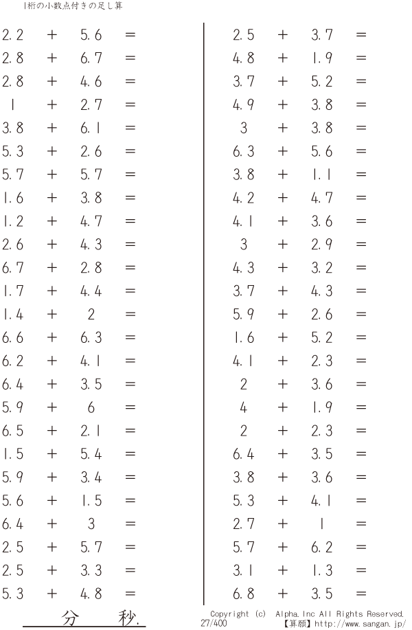 上記のボタンから「1桁の小数点付きの足し算」の算数数学ドリル・計算ドリル(PDFプリント)がダウンロードできます。個人利用は無料です(家庭以外での配布は有料です)。