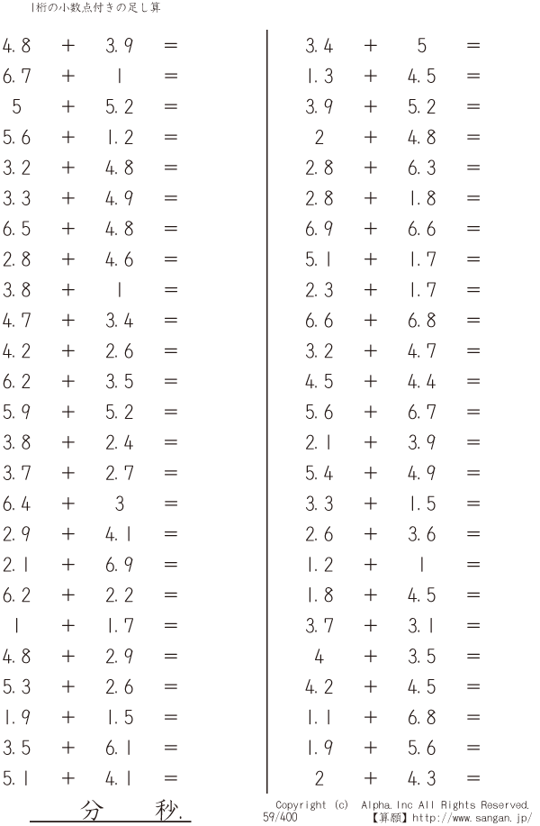 上記のボタンから「1桁の小数点付きの足し算」の算数数学ドリル・計算ドリル(PDFプリント)がダウンロードできます。個人利用は無料です(家庭以外での配布は有料です)。
