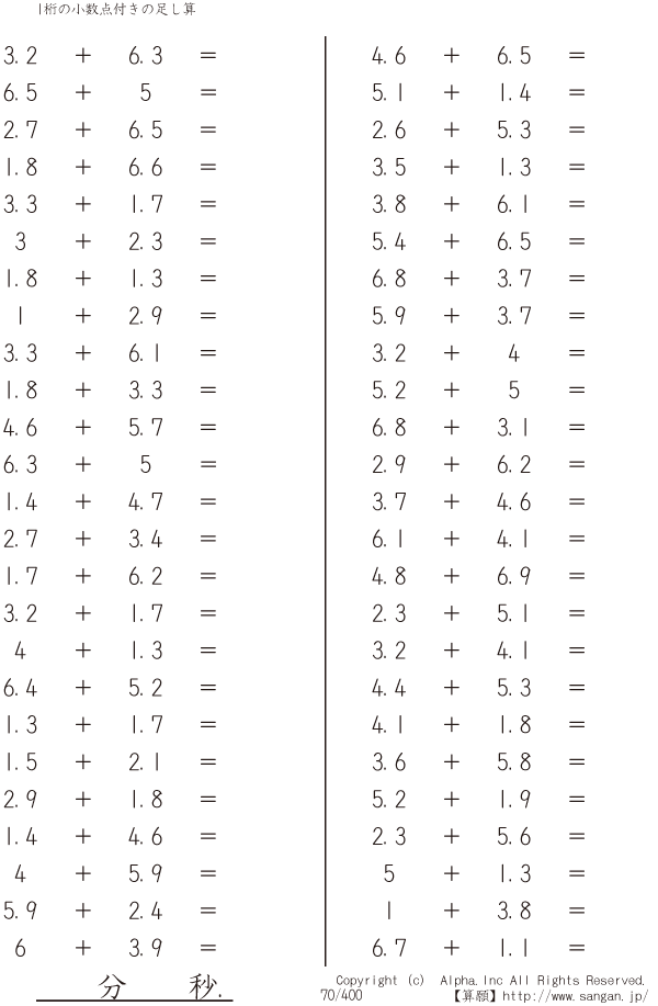 上記のボタンから「1桁の小数点付きの足し算」の算数数学ドリル・計算ドリル(PDFプリント)がダウンロードできます。個人利用は無料です(家庭以外での配布は有料です)。