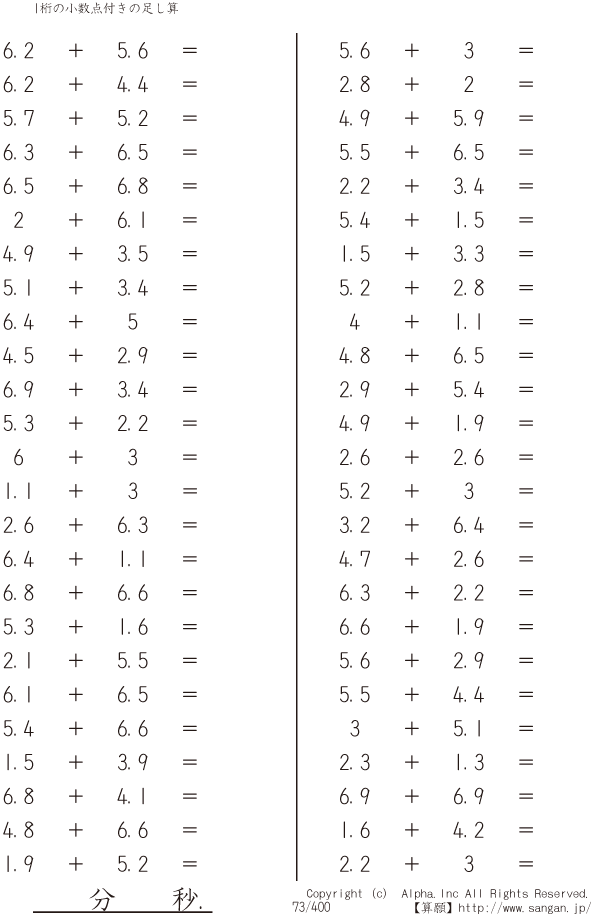 上記のボタンから「1桁の小数点付きの足し算」の算数数学ドリル・計算ドリル(PDFプリント)がダウンロードできます。個人利用は無料です(家庭以外での配布は有料です)。