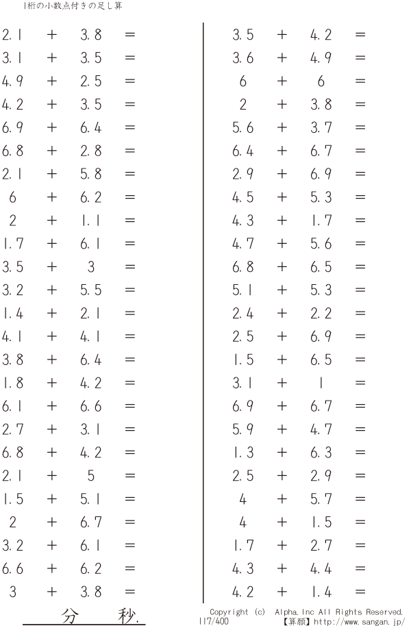 上記のボタンから「1桁の小数点付きの足し算」の算数数学ドリル・計算ドリル(PDFプリント)がダウンロードできます。個人利用は無料です(家庭以外での配布は有料です)。