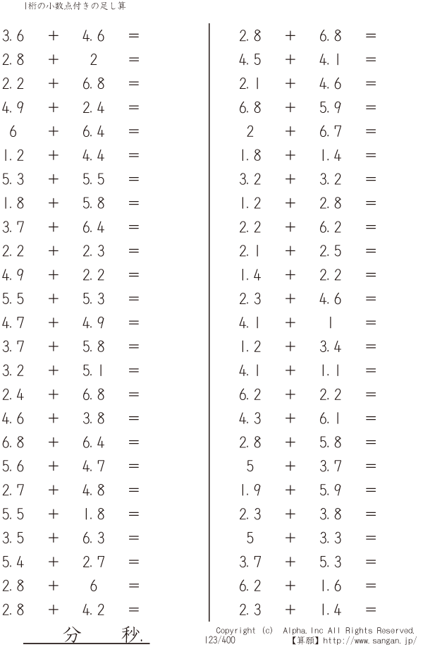 上記のボタンから「1桁の小数点付きの足し算」の算数数学ドリル・計算ドリル(PDFプリント)がダウンロードできます。個人利用は無料です(家庭以外での配布は有料です)。