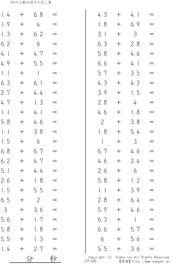上記のボタンから「1桁の小数点付きの足し算」の算数数学ドリル・計算ドリル(PDFプリント)がダウンロードできます。個人利用は無料です(家庭以外での配布は有料です)。