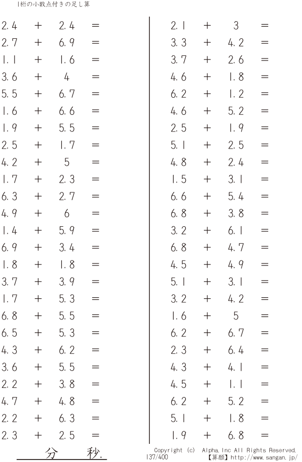 上記のボタンから「1桁の小数点付きの足し算」の算数数学ドリル・計算ドリル(PDFプリント)がダウンロードできます。個人利用は無料です(家庭以外での配布は有料です)。