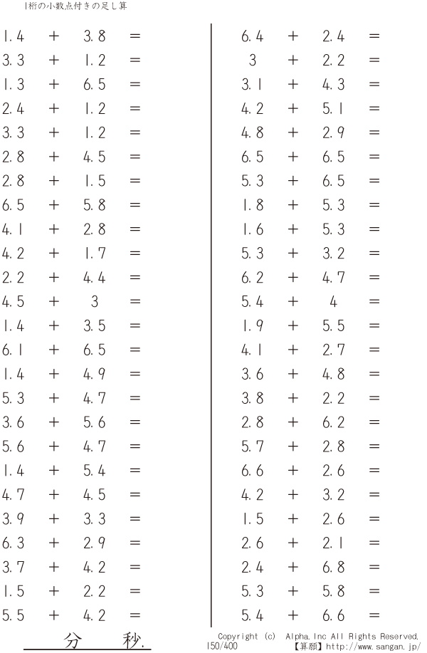 上記のボタンから「1桁の小数点付きの足し算」の算数数学ドリル・計算ドリル(PDFプリント)がダウンロードできます。個人利用は無料です(家庭以外での配布は有料です)。