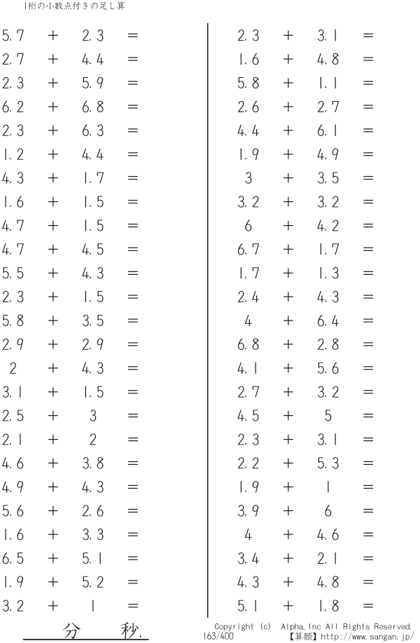 上記のボタンから「1桁の小数点付きの足し算」の算数数学ドリル・計算ドリル(PDFプリント)がダウンロードできます。個人利用は無料です(家庭以外での配布は有料です)。