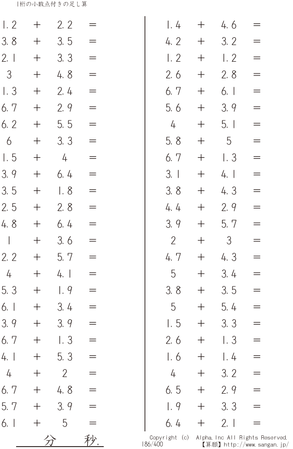 上記のボタンから「1桁の小数点付きの足し算」の算数数学ドリル・計算ドリル(PDFプリント)がダウンロードできます。個人利用は無料です(家庭以外での配布は有料です)。