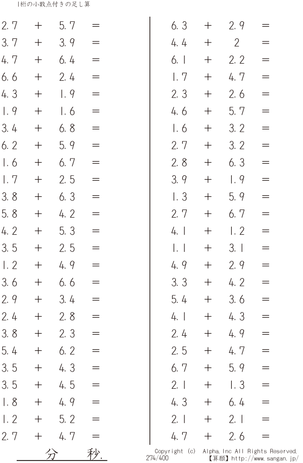 上記のボタンから「1桁の小数点付きの足し算」の算数数学ドリル・計算ドリル(PDFプリント)がダウンロードできます。個人利用は無料です(家庭以外での配布は有料です)。