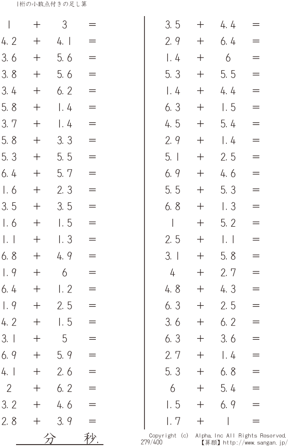 上記のボタンから「1桁の小数点付きの足し算」の算数数学ドリル・計算ドリル(PDFプリント)がダウンロードできます。個人利用は無料です(家庭以外での配布は有料です)。