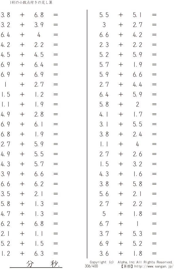 上記のボタンから「1桁の小数点付きの足し算」の算数数学ドリル・計算ドリル(PDFプリント)がダウンロードできます。個人利用は無料です(家庭以外での配布は有料です)。