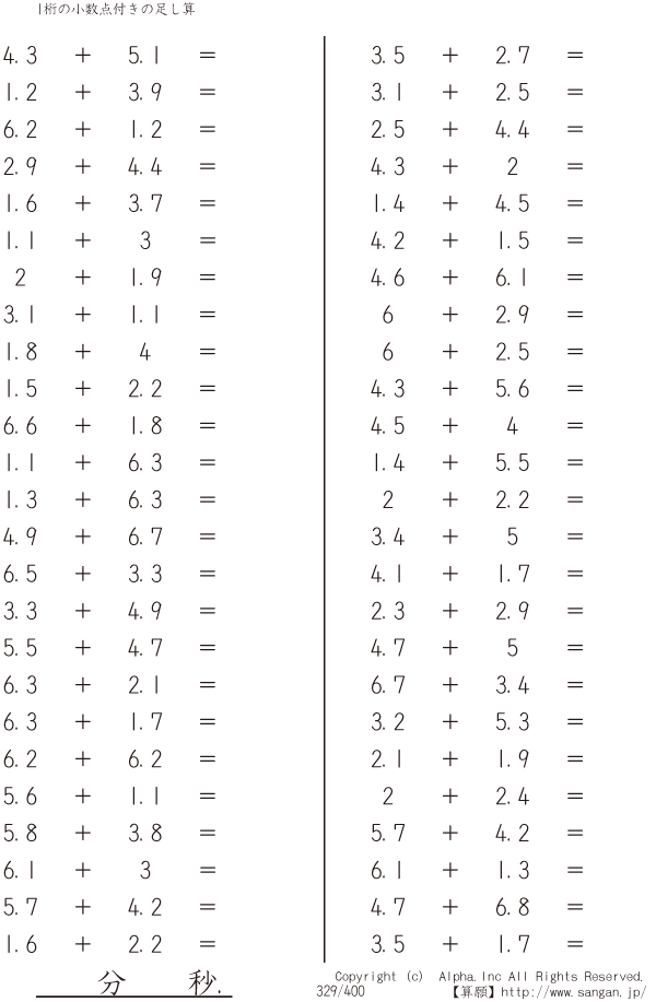 上記のボタンから「1桁の小数点付きの足し算」の算数数学ドリル・計算ドリル(PDFプリント)がダウンロードできます。個人利用は無料です(家庭以外での配布は有料です)。