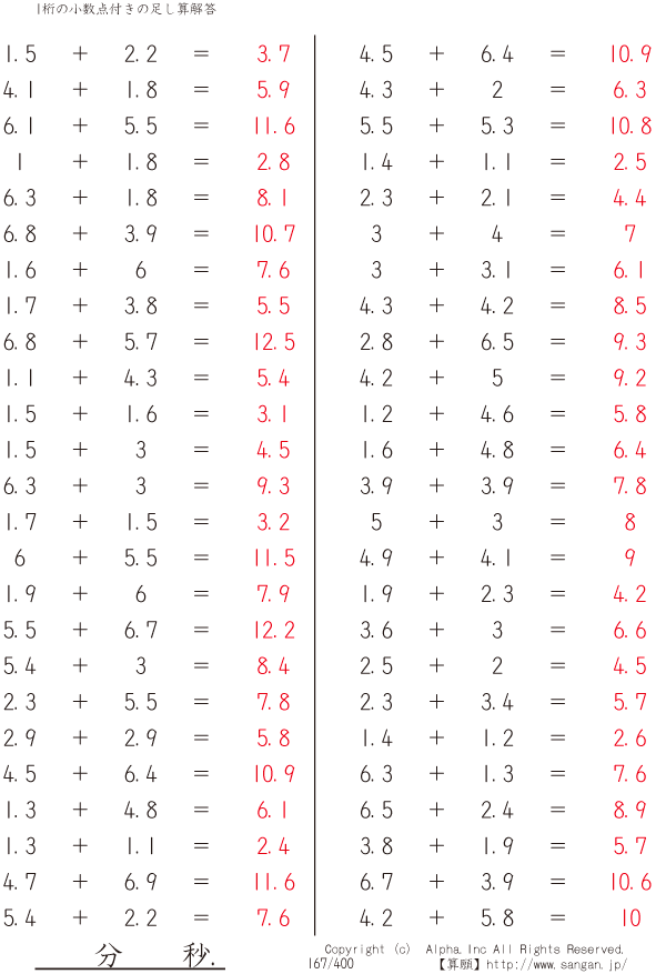 上記のボタンから「1桁の小数点付きの足し算」の算数数学ドリル・計算ドリル(PDFプリント)がダウンロードできます。個人利用は無料です(家庭以外での配布は有料です)。