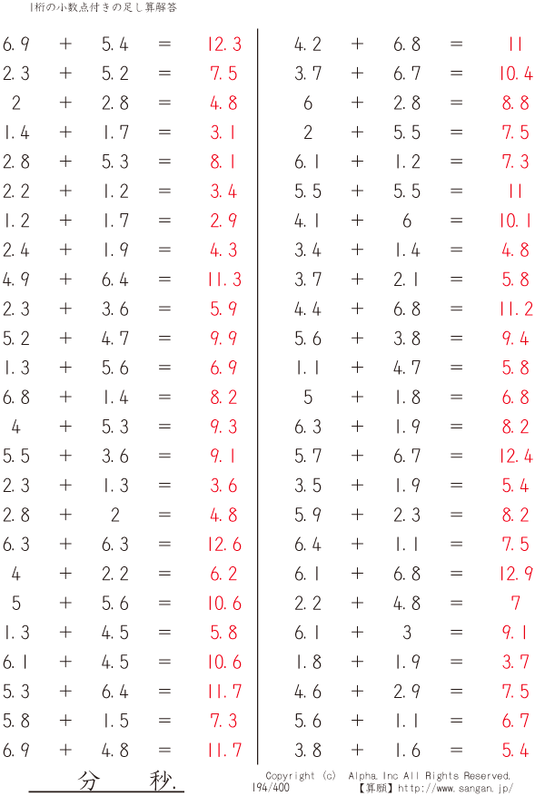 上記のボタンから「1桁の小数点付きの足し算」の算数数学ドリル・計算ドリル(PDFプリント)がダウンロードできます。個人利用は無料です(家庭以外での配布は有料です)。