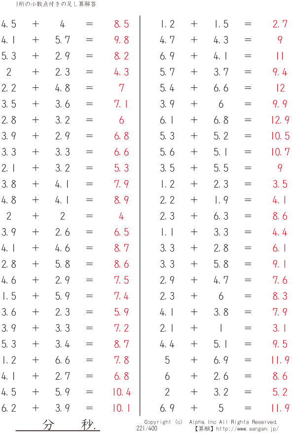 上記のボタンから「1桁の小数点付きの足し算」の算数数学ドリル・計算ドリル(PDFプリント)がダウンロードできます。個人利用は無料です(家庭以外での配布は有料です)。