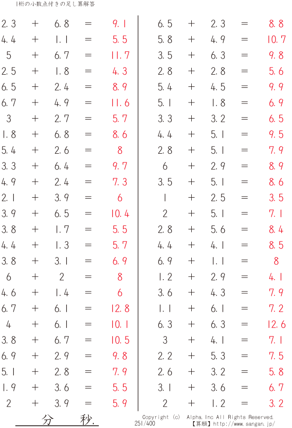 上記のボタンから「1桁の小数点付きの足し算」の算数数学ドリル・計算ドリル(PDFプリント)がダウンロードできます。個人利用は無料です(家庭以外での配布は有料です)。