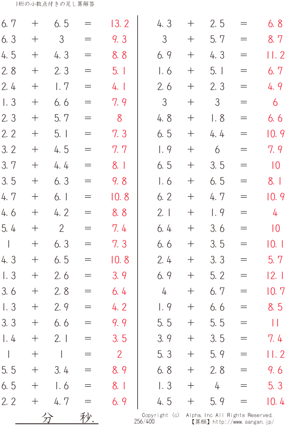 上記のボタンから「1桁の小数点付きの足し算」の算数数学ドリル・計算ドリル(PDFプリント)がダウンロードできます。個人利用は無料です(家庭以外での配布は有料です)。