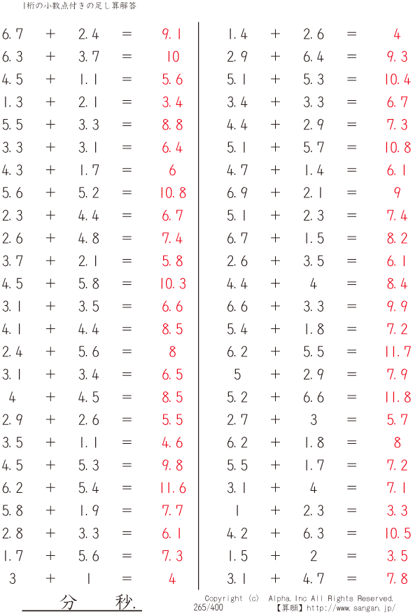 上記のボタンから「1桁の小数点付きの足し算」の算数数学ドリル・計算ドリル(PDFプリント)がダウンロードできます。個人利用は無料です(家庭以外での配布は有料です)。