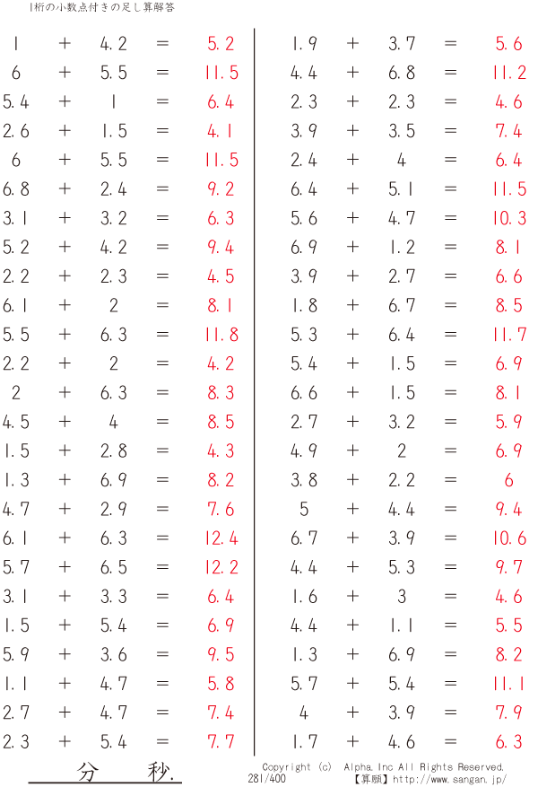 1桁の小数点付きの足し算 [解答]281/400