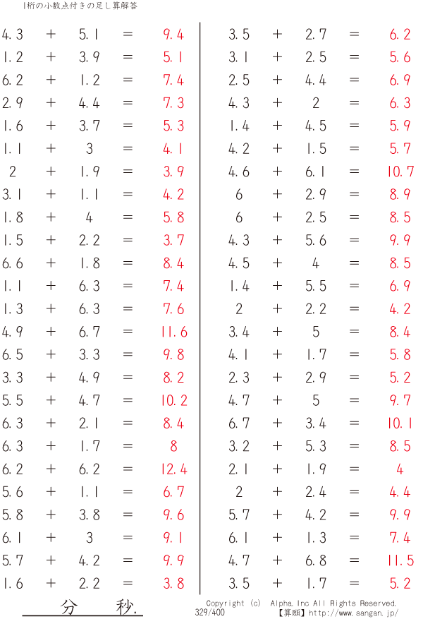 上記のボタンから「1桁の小数点付きの足し算」の算数数学ドリル・計算ドリル(PDFプリント)がダウンロードできます。個人利用は無料です(家庭以外での配布は有料です)。