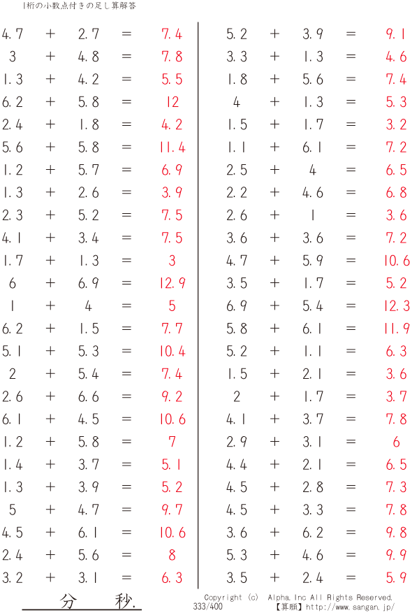 上記のボタンから「1桁の小数点付きの足し算」の算数数学ドリル・計算ドリル(PDFプリント)がダウンロードできます。個人利用は無料です(家庭以外での配布は有料です)。