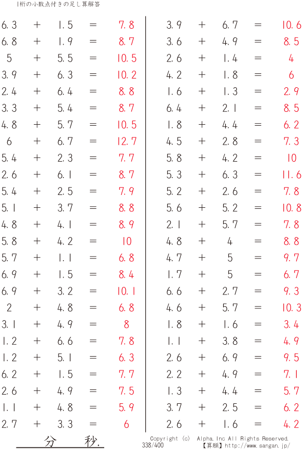 上記のボタンから「1桁の小数点付きの足し算」の算数数学ドリル・計算ドリル(PDFプリント)がダウンロードできます。個人利用は無料です(家庭以外での配布は有料です)。