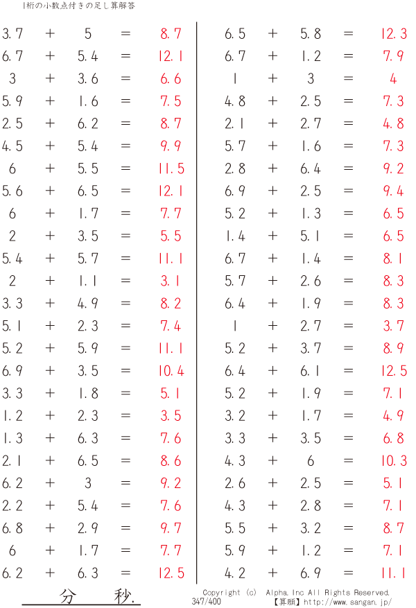 上記のボタンから「1桁の小数点付きの足し算」の算数数学ドリル・計算ドリル(PDFプリント)がダウンロードできます。個人利用は無料です(家庭以外での配布は有料です)。