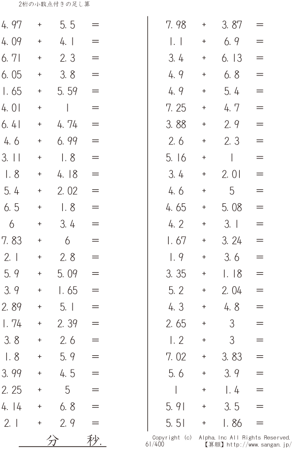 上記のボタンから「2桁の小数点付きの足し算」の算数数学ドリル・計算ドリル(PDFプリント)がダウンロードできます。個人利用は無料です(家庭以外での配布は有料です)。