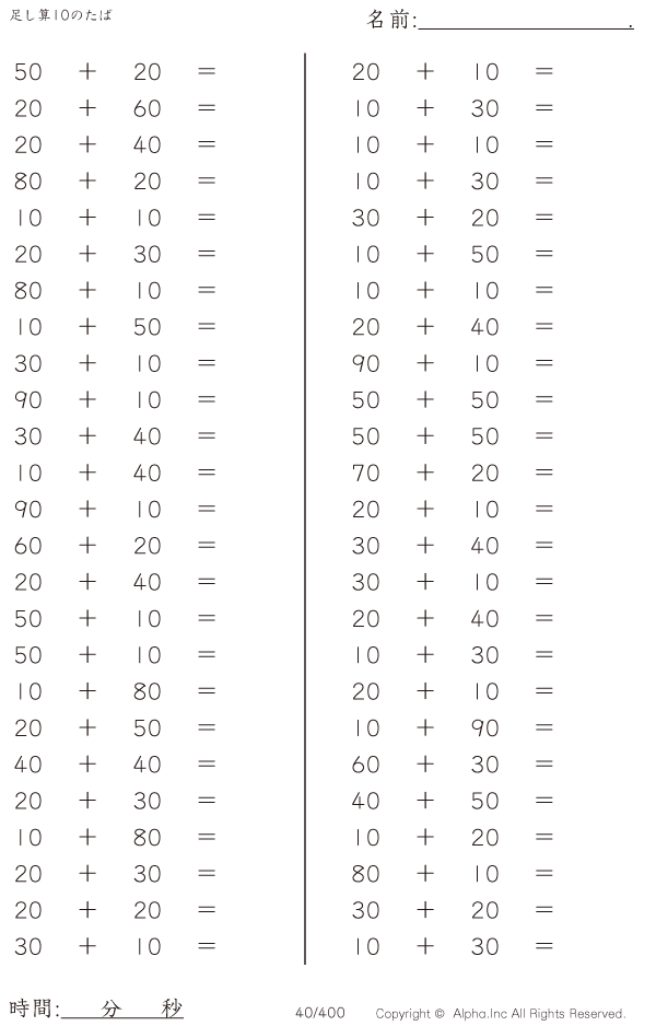 上記のボタンから「足し算10のたば(100まで)」の算数数学ドリル・計算ドリル(PDFプリント)がダウンロードできます。個人利用は無料です(家庭以外での配布は有料です)。