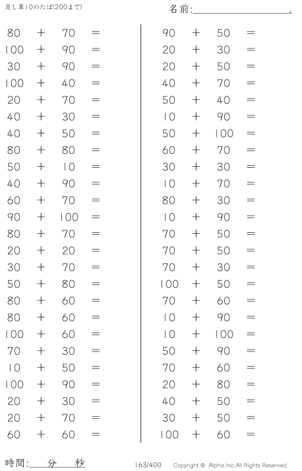 上記のボタンから「足し算10のたば(200まで)」の算数数学ドリル・計算ドリル(PDFプリント)がダウンロードできます。個人利用は無料です(家庭以外での配布は有料です)。