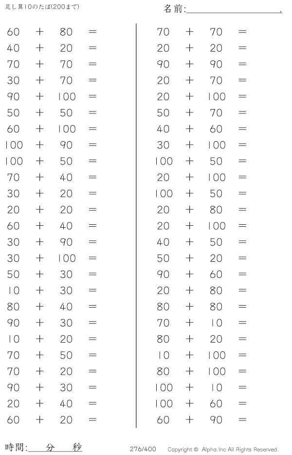 上記のボタンから「足し算10のたば(200まで)」の算数数学ドリル・計算ドリル(PDFプリント)がダウンロードできます。個人利用は無料です(家庭以外での配布は有料です)。