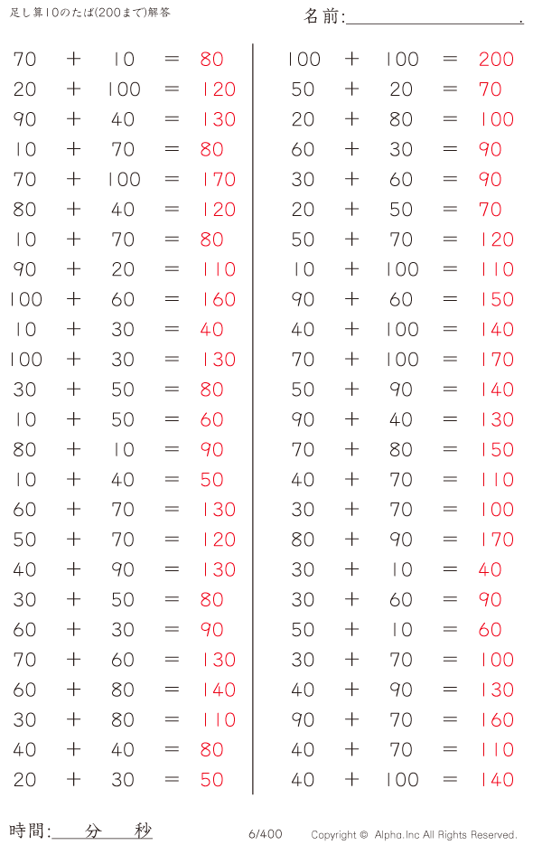 上記のボタンから「足し算10のたば(200まで)」の算数数学ドリル・計算ドリル(PDFプリント)がダウンロードできます。個人利用は無料です(家庭以外での配布は有料です)。