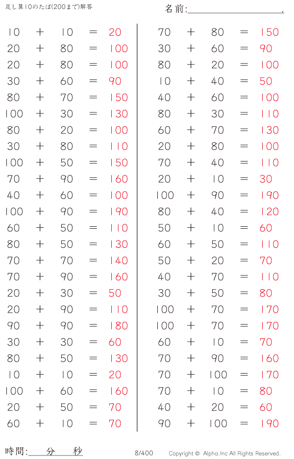 上記のボタンから「足し算10のたば(200まで)」の算数数学ドリル・計算ドリル(PDFプリント)がダウンロードできます。個人利用は無料です(家庭以外での配布は有料です)。