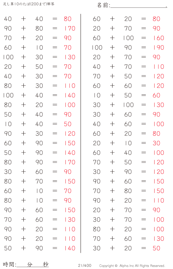 上記のボタンから「足し算10のたば(200まで)」の算数数学ドリル・計算ドリル(PDFプリント)がダウンロードできます。個人利用は無料です(家庭以外での配布は有料です)。