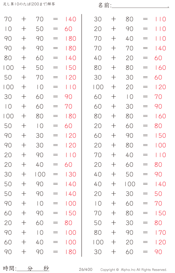 上記のボタンから「足し算10のたば(200まで)」の算数数学ドリル・計算ドリル(PDFプリント)がダウンロードできます。個人利用は無料です(家庭以外での配布は有料です)。