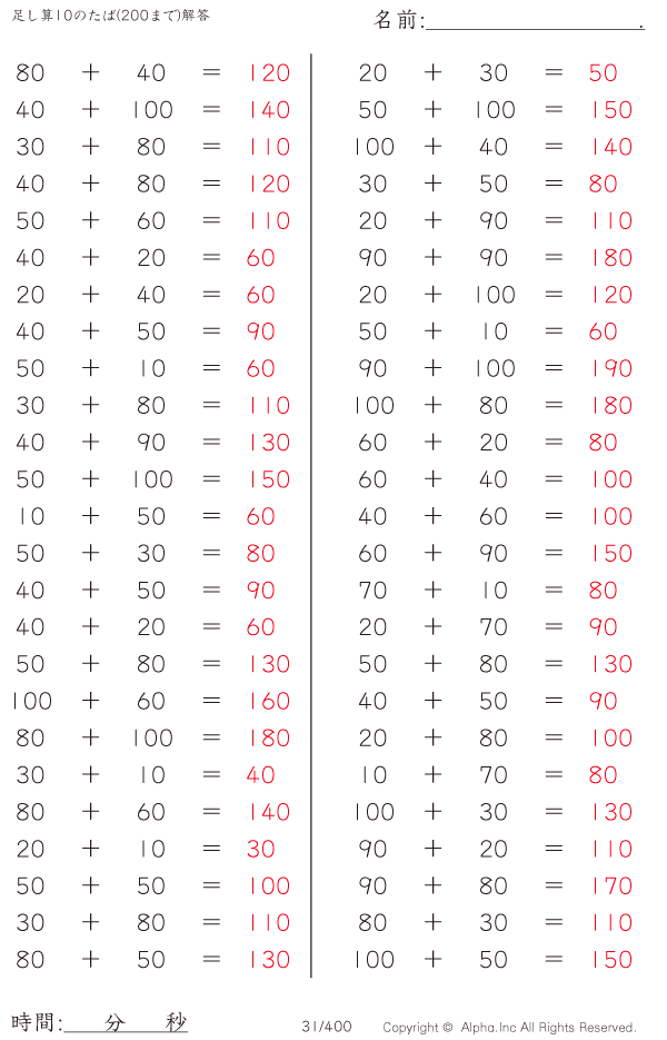 上記のボタンから「足し算10のたば(200まで)」の算数数学ドリル・計算ドリル(PDFプリント)がダウンロードできます。個人利用は無料です(家庭以外での配布は有料です)。