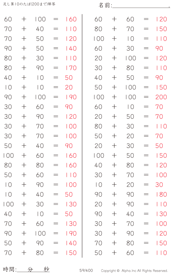 上記のボタンから「足し算10のたば(200まで)」の算数数学ドリル・計算ドリル(PDFプリント)がダウンロードできます。個人利用は無料です(家庭以外での配布は有料です)。
