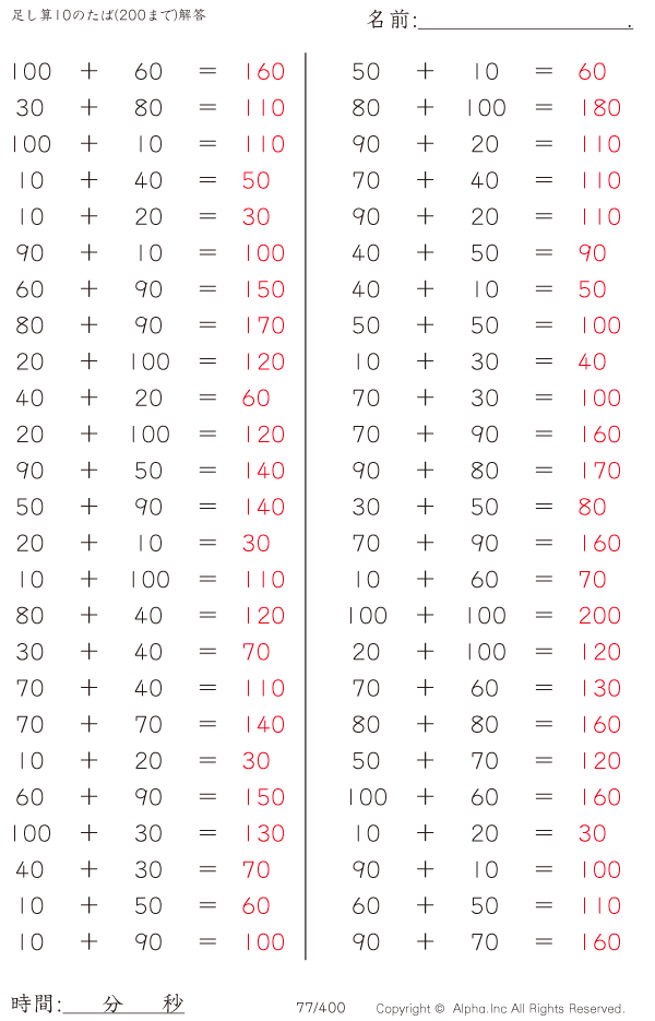 上記のボタンから「足し算10のたば(200まで)」の算数数学ドリル・計算ドリル(PDFプリント)がダウンロードできます。個人利用は無料です(家庭以外での配布は有料です)。