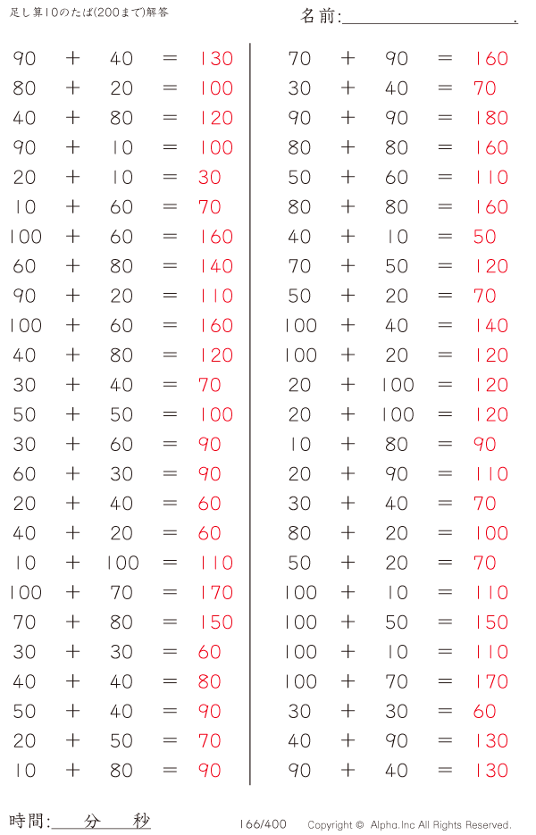 上記のボタンから「足し算10のたば(200まで)」の算数数学ドリル・計算ドリル(PDFプリント)がダウンロードできます。個人利用は無料です(家庭以外での配布は有料です)。