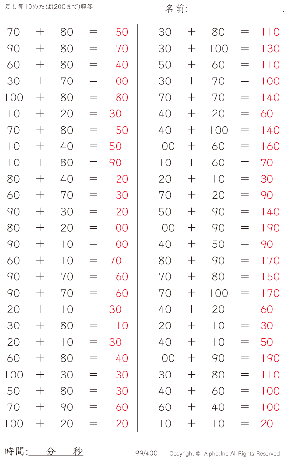 足し算10のたば(200まで)の問題解答ガイド