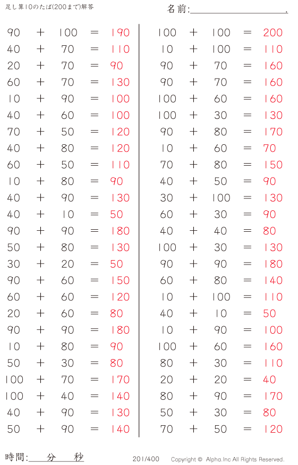 上記のボタンから「足し算10のたば(200まで)」の算数数学ドリル・計算ドリル(PDFプリント)がダウンロードできます。個人利用は無料です(家庭以外での配布は有料です)。