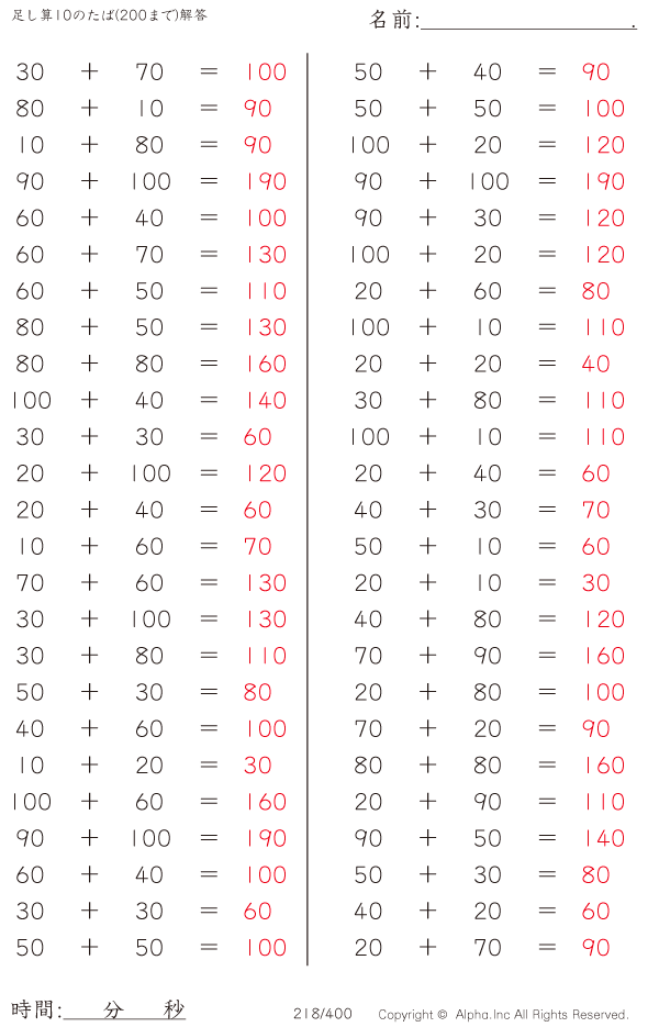 上記のボタンから「足し算10のたば(200まで)」の算数数学ドリル・計算ドリル(PDFプリント)がダウンロードできます。個人利用は無料です(家庭以外での配布は有料です)。