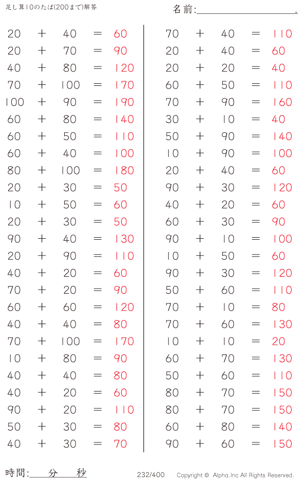 上記のボタンから「足し算10のたば(200まで)」の算数数学ドリル・計算ドリル(PDFプリント)がダウンロードできます。個人利用は無料です(家庭以外での配布は有料です)。