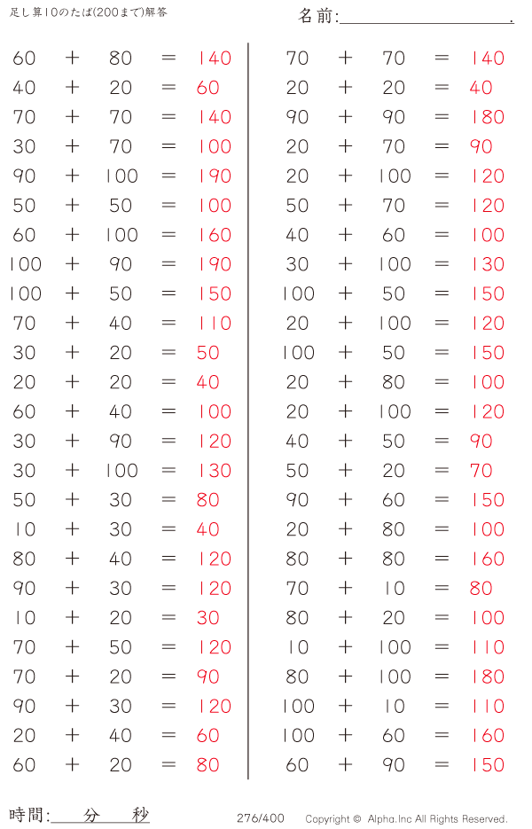 上記のボタンから「足し算10のたば(200まで)」の算数数学ドリル・計算ドリル(PDFプリント)がダウンロードできます。個人利用は無料です(家庭以外での配布は有料です)。