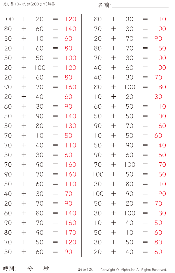 足し算10のたば(200まで) [解答]345/400