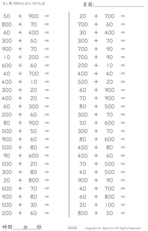上記のボタンから「足し算100のたばと10のたば」の算数数学ドリル・計算ドリル(PDFプリント)がダウンロードできます。個人利用は無料です(家庭以外での配布は有料です)。