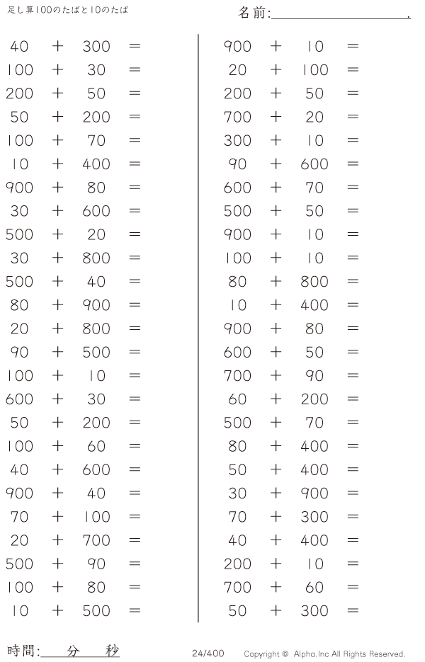 上記のボタンから「足し算100のたばと10のたば」の算数数学ドリル・計算ドリル(PDFプリント)がダウンロードできます。個人利用は無料です(家庭以外での配布は有料です)。