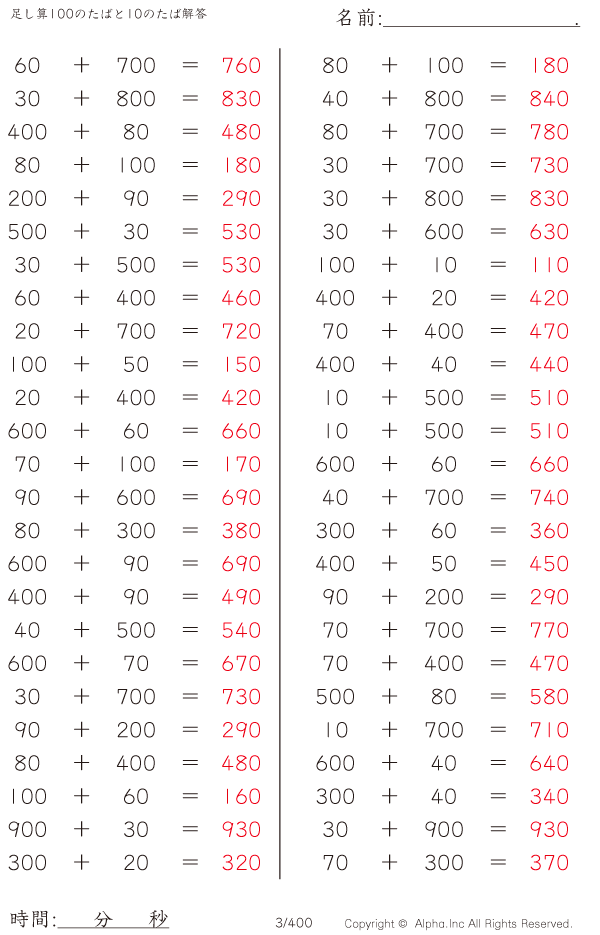 上記のボタンから「足し算100のたばと10のたば」の算数数学ドリル・計算ドリル(PDFプリント)がダウンロードできます。個人利用は無料です(家庭以外での配布は有料です)。