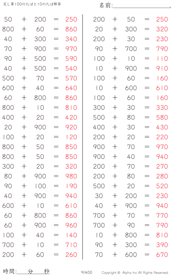 上記のボタンから「足し算100のたばと10のたば」の算数数学ドリル・計算ドリル(PDFプリント)がダウンロードできます。個人利用は無料です(家庭以外での配布は有料です)。