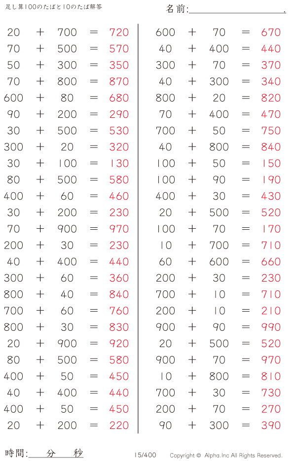 上記のボタンから「足し算100のたばと10のたば」の算数数学ドリル・計算ドリル(PDFプリント)がダウンロードできます。個人利用は無料です(家庭以外での配布は有料です)。